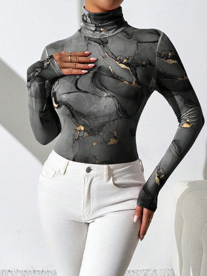 Add a touch of modern elegance to your wardrobe with this high-neck marble print top. Its unique design blends sophistication and boldness with a gray marble pattern accented by golden streaks, giving it a luxurious and captivating look.